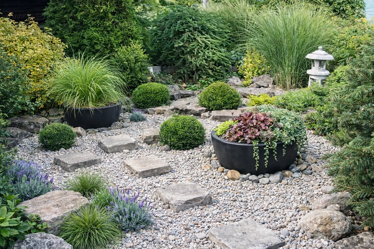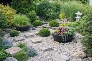 Dekorace: Kameny štěrk rostliny beton plastové nádoby