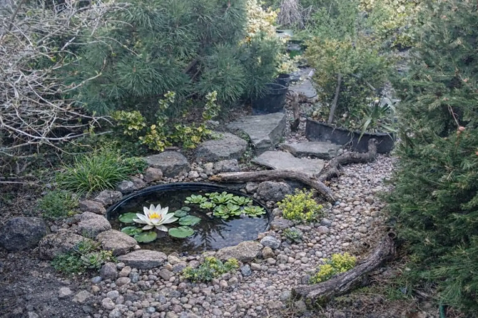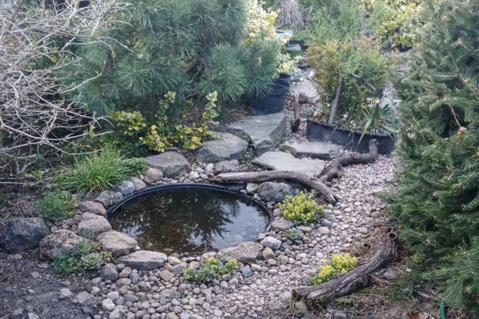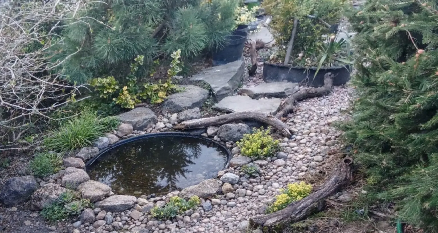Popis: zahrádka jako skalka (teď už bez jezírka) -- skalka bez jezírka jako zahrádka