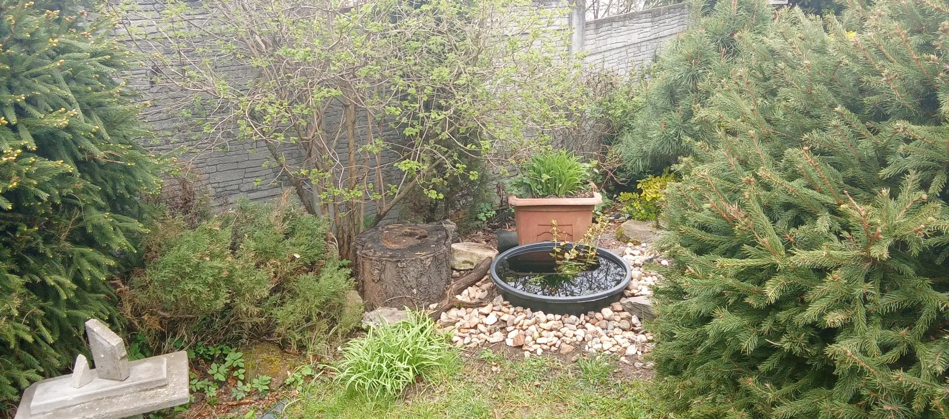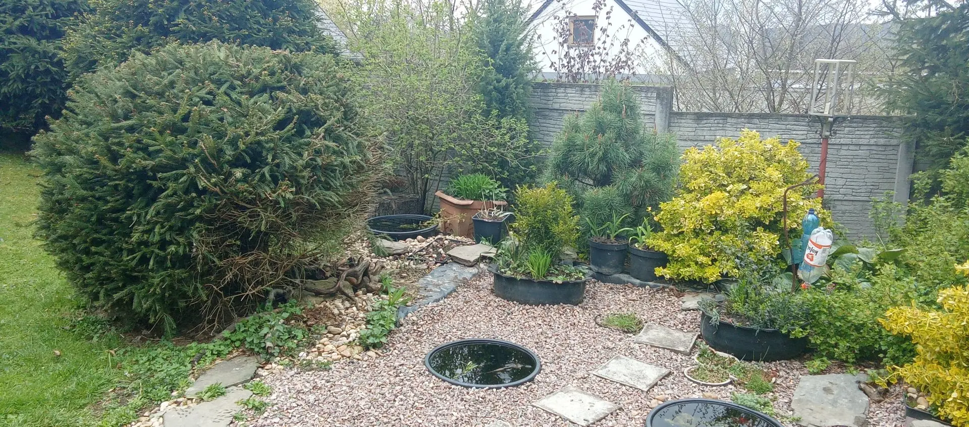 Pozadí: sousedův drátěný plot na sever,tújky,jehličnany sousedův betonový plot na západ