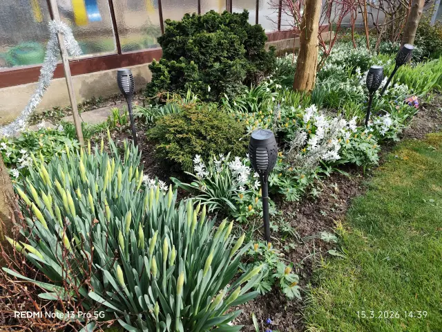 Dvanačtyři (je)štěrková | K plotu přibyl trs sněženek-mají takové bohatší kvitky,;do "lavóru" přibyl leknín a vrbina..jen to tak nějak vzájemně propojit,zakomponovat a sjednotit..Ještě v 10 hod byla na trávě jinovatka.Kvete první narcis.Kousek od narcisu jsem zahlédl i první šedohnědou ještěrku (na štěrku) |