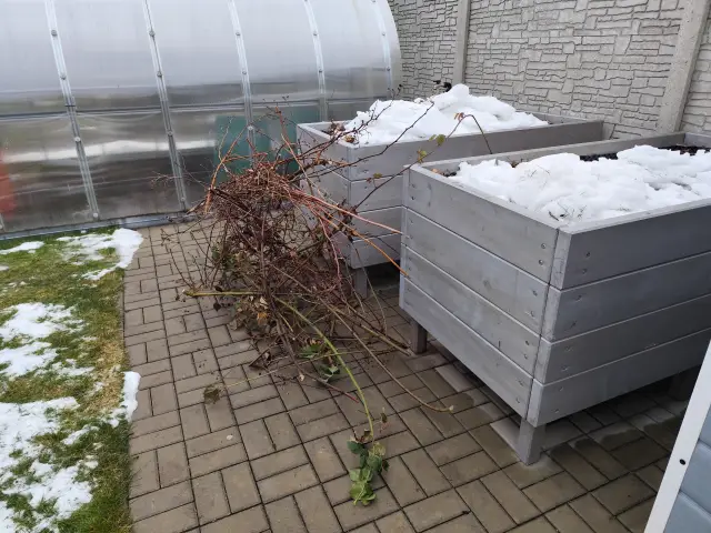 Slatina | Ostříháno víno, angrešt, maliny a ostružiny. Ve vyvýšených záhonech i kolem stromů pořád leží sníh. |